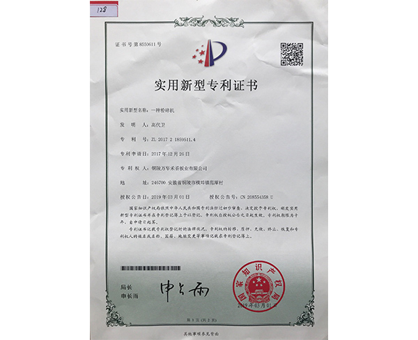 2019113314584一種稭稈刨花(huā)闆生産(chǎn)用(yòng)表層料防堵塞施膠裝(zhuāng)置(發明)