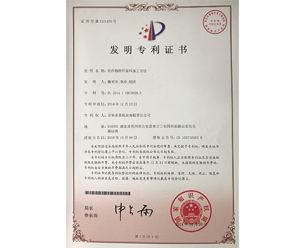 2014108038280農作(zuò)物(wù)稭稈原料加工(gōng)方法證書(發明專利)